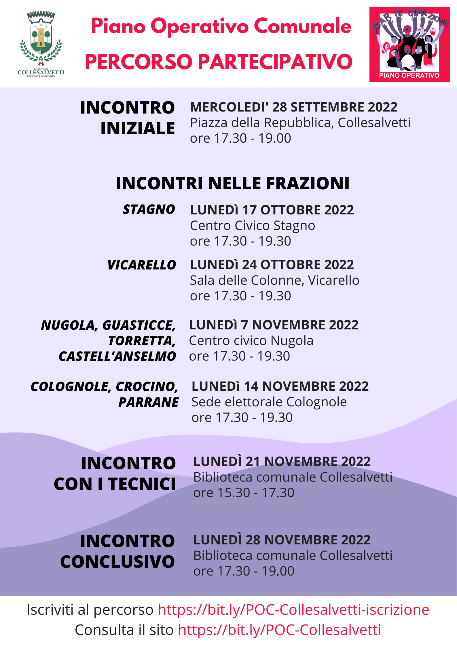 Appuntamento Mercoledì 28 settembre presso la Sala Spettacolo "Dino Formichini", a Collesalvetti, per il primo degli incontri pubblici dedicati al piano operativo e alle trasformazioni del territorio.