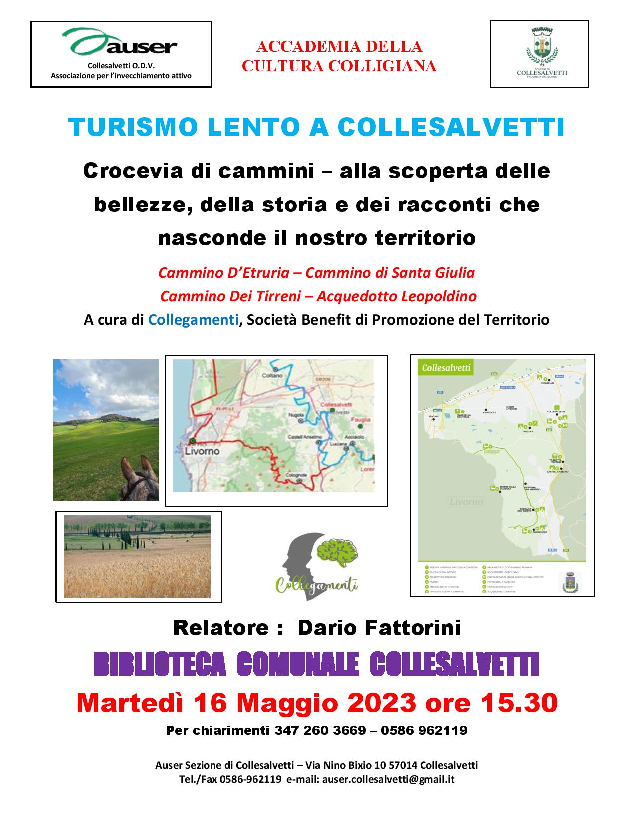 Martedì 16 maggio 2023 alle ore 15.30, presso la Biblioteca Comunale "Chiara Cataldi", Auser, Accademia della Cultura Colligiana, con il patrocinio del Comune, organizza la consueta conferenza settimanale, dedicata al tema del Turismo Lento a Collesalvetti, crocevia di cammini, per un viaggio alla scoperta delle bellezze, della storia e dei racconti che nasconde il nostro territorio.